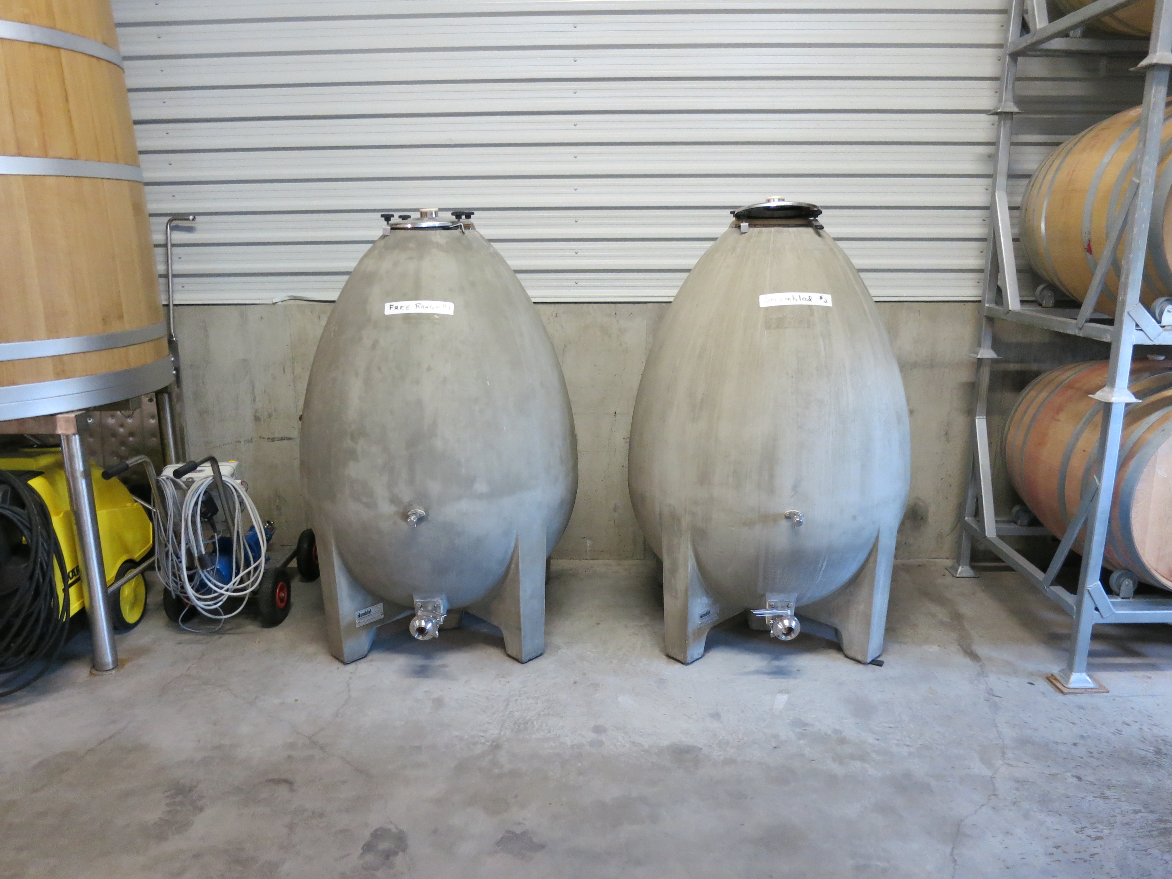 His winery is super functional and he and one assistant winemaker handle the production of 5000 cases per year with no other help in the winery. He has some great ideas which I like and the fermentation eggs are on my list for our winery upgrade. Because of their shape the reactions during fermentation continually cause the juice to be strirred. He also has some very interesting 500l barrels for red wine whole bunch fermentation and used compressed air for his punch downs and pump overs.