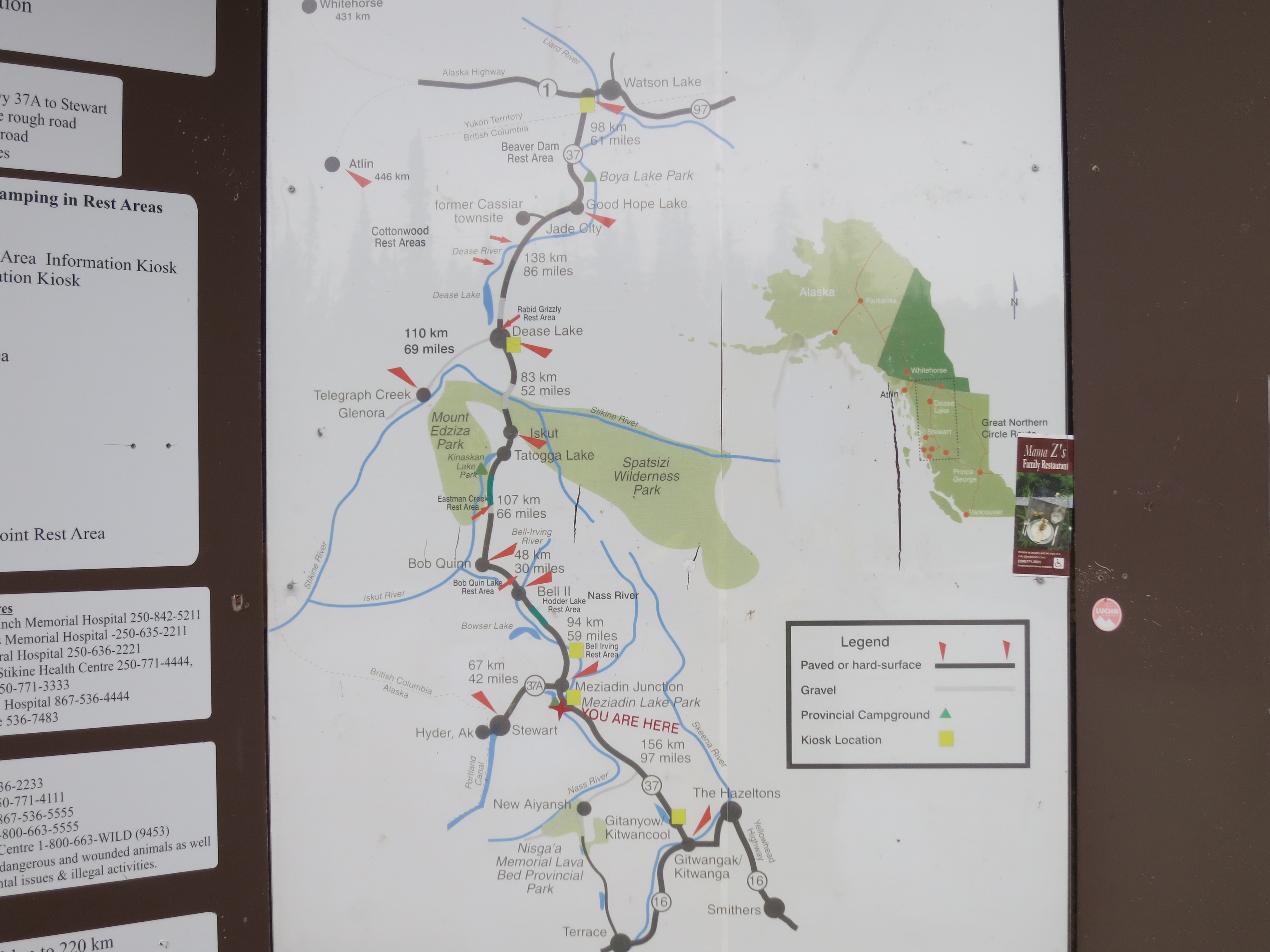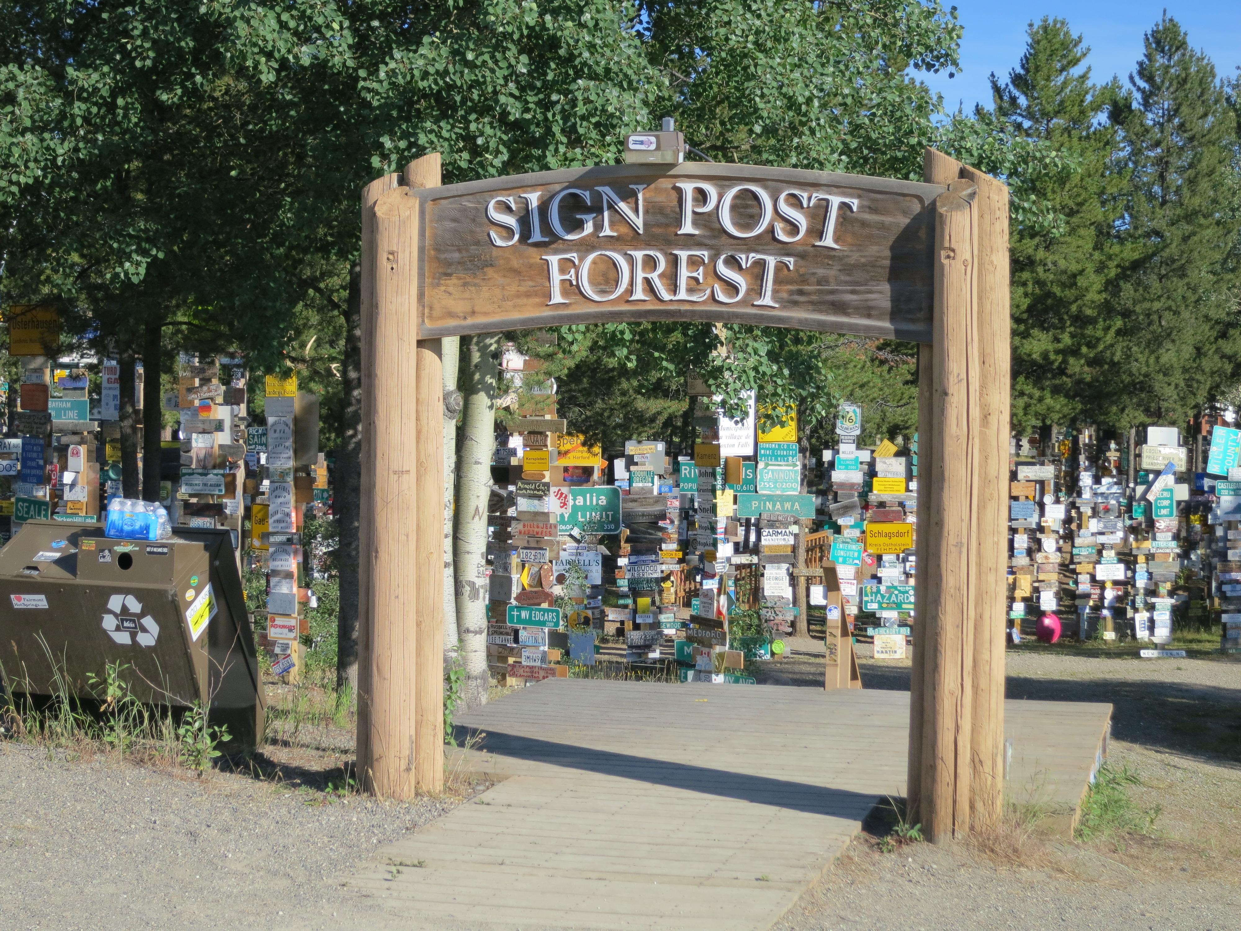 On the way back I stop off at the amazing signpost forest and then head off for Teslin some 280 kms away. An easy ride. It will take me less than 3 hours and I will be there by 13h00. So time for a bit of dawdling. The road is excellent with a few gravel patches. The trickiest bit is over the bridges, many of which have either a wooden or a grated metal sheet floor. The front wheel feels as if it is in a rut and it is very disconcerting as it sways back and forth. The technique required to have a happy rider and mount is to stand, hands very lightly on the handles, legs away from Bonnie and then let her sway and buck, as she needs to, every so often a gentle touch to get her back in the right direction. It is also important, as always, to keep the forward momentum going otherwise there is the ever-present danger of slipping out of the slot and off.