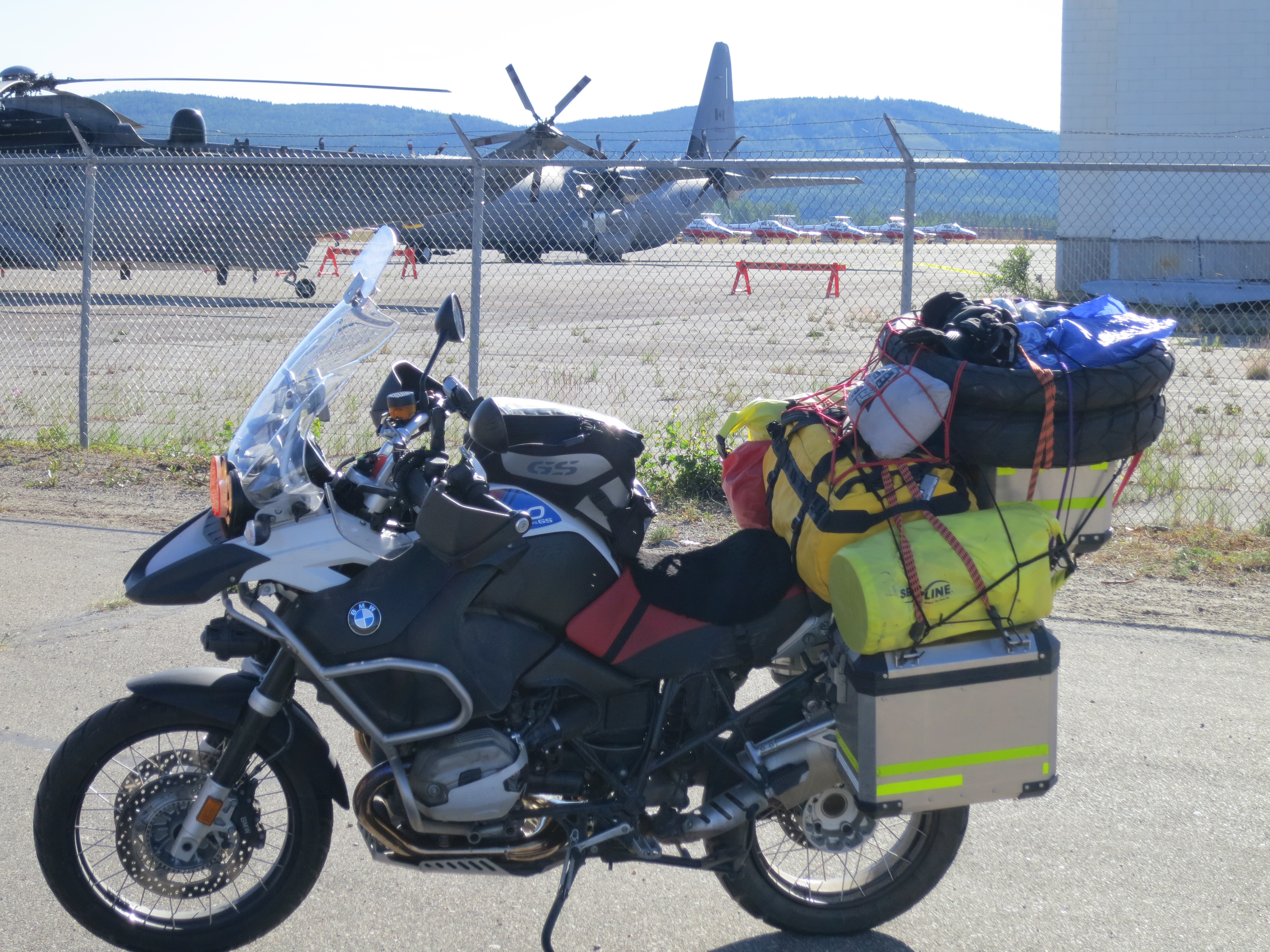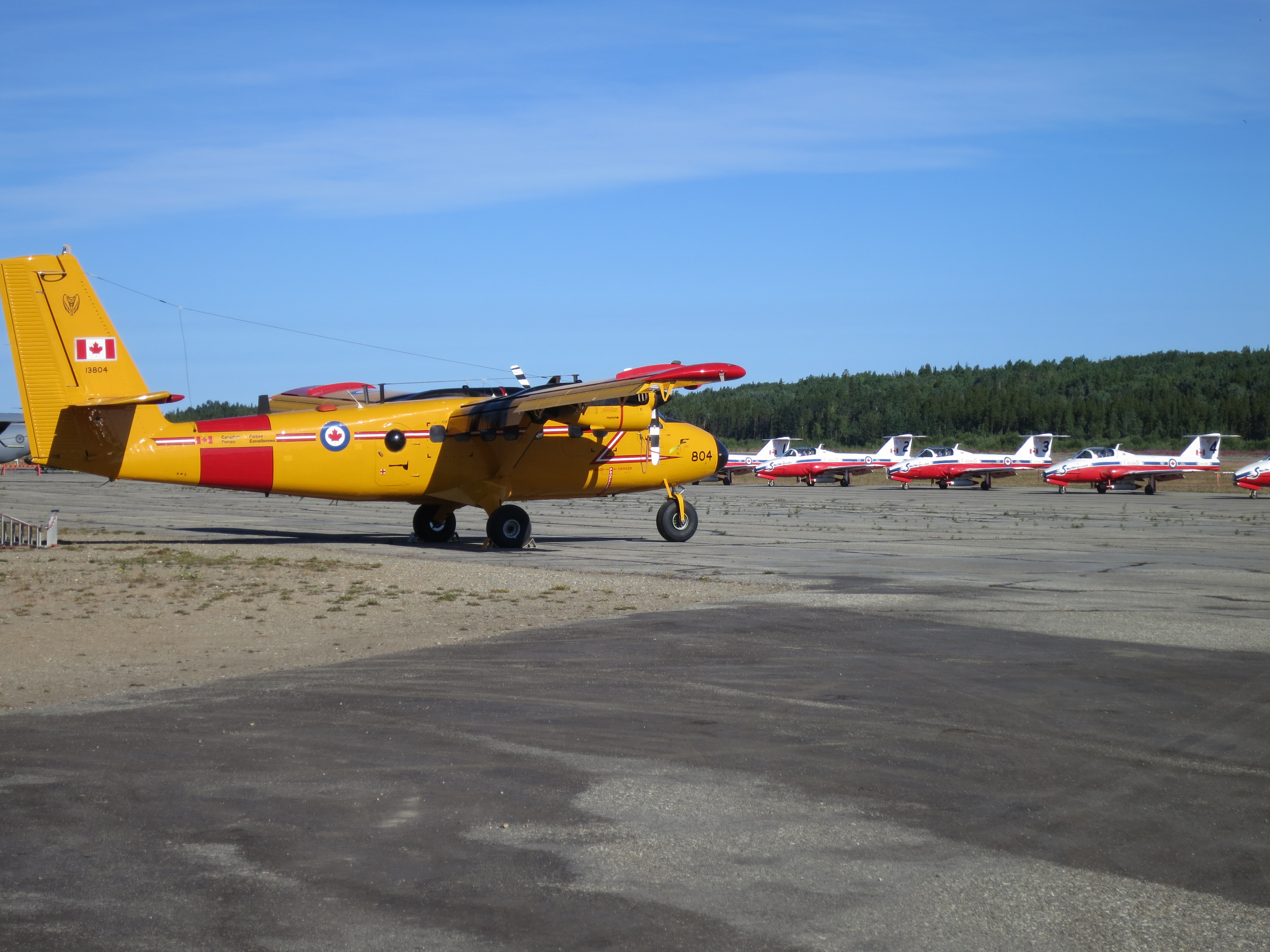 Yesterday on the way from Whitehorse I ride out to the airport. There parked with absolutely zero security are the Snowbird’s Tudor jets, two Lockheed Hercules, an airforce Canadair CL 604 executive jet, two Caribous, a P 3 maritime Search and Rescue aircraft plus a few helicopters. This is all part of a “ show the flag” mission run by the airforce to bring what it does to people in remote areas. They have been all over the northern areas of Canada during the past two weeks.