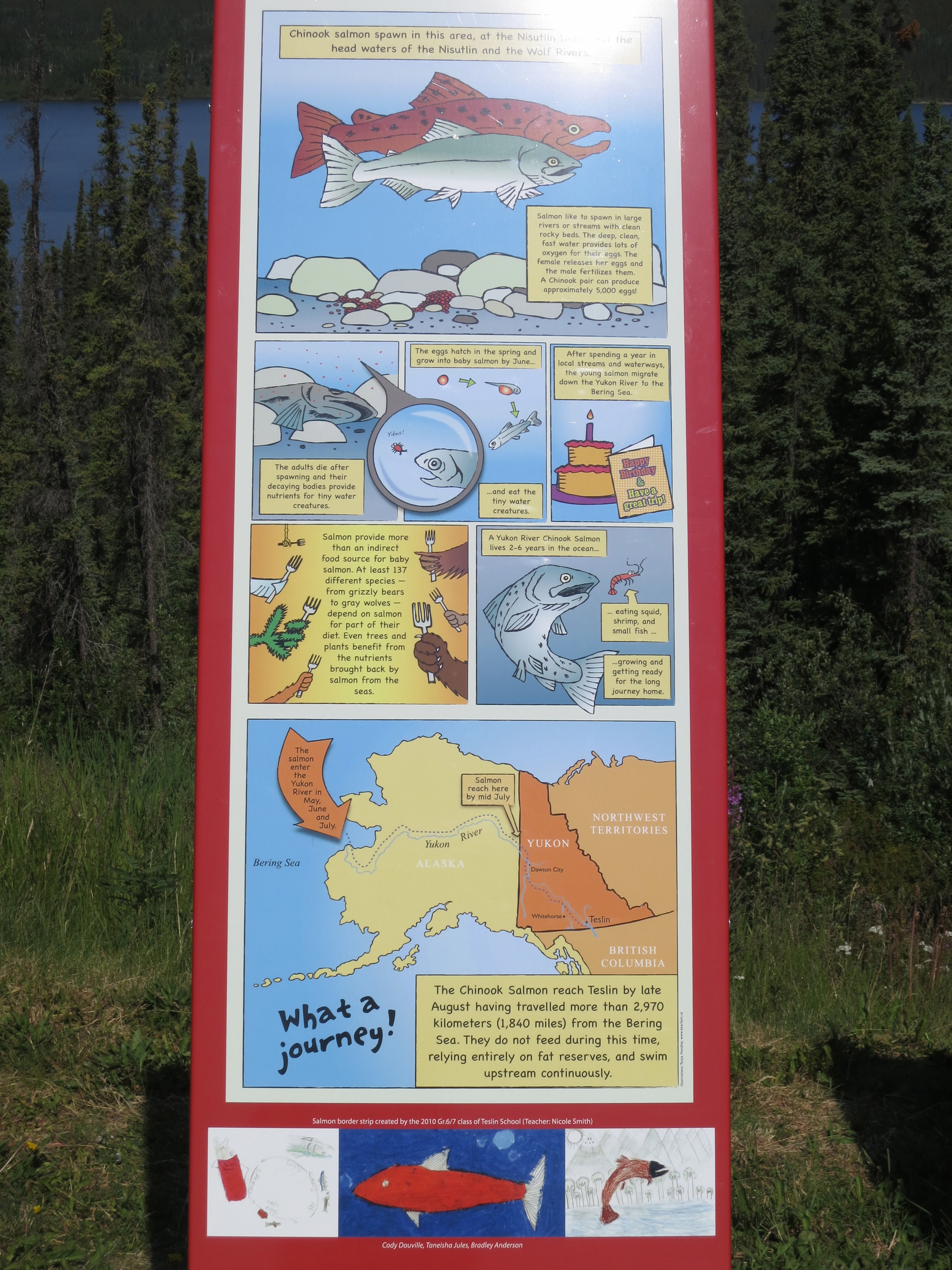 They swim here all the way from the Bering Sea. This involves a distance of nearly 2000 miles, up against the flow of the Yukon River. They do not feed at all on this mammoth swim, relying only on their own fat reserves. On arrival at the gravel beds they spawn, fertilize their eggs and die. This starts a cycle. The rotting carcasses feed small aquatic animals. The eggs hatch and the fingerlings start to feed off the very same aquatic animals. They then spend about a year in the river and this lake. Then driven by the forces of nature, they swim down the Yukon all the way to the Bering Ocean, off the west coast of Alaska between it and Siberia. This is where Max crossed from the Russia into Alaska on his bicycle.