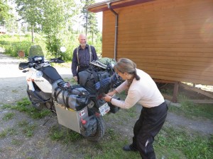 On the way up to breakfast I stop and talk to Lindsay and Marian. They are my neighbours, the retired couple from Pender Island which is next to Salt Spring Island (near Vancouver Island). They are on a KTM 990, a bike similar to Bonnie. They have traveled a bit over 30k kms on it in the 20 months in which they have owned it. Notice it is not a “her” as KTM’s, although great adventure bikes, do not have the personality of a BMW. They are Austrian and hence a bit sexless. One of my first real rides was on an Austrian and the memories have not etched themselves favourably. Marian rides her own bike but prefers to sit behind Lindsay on the big trips. They are heading to Anchorage, Fairbanks and then Inuvik, which is on the Arctic Circle. We discuss long trips and mine being solo.