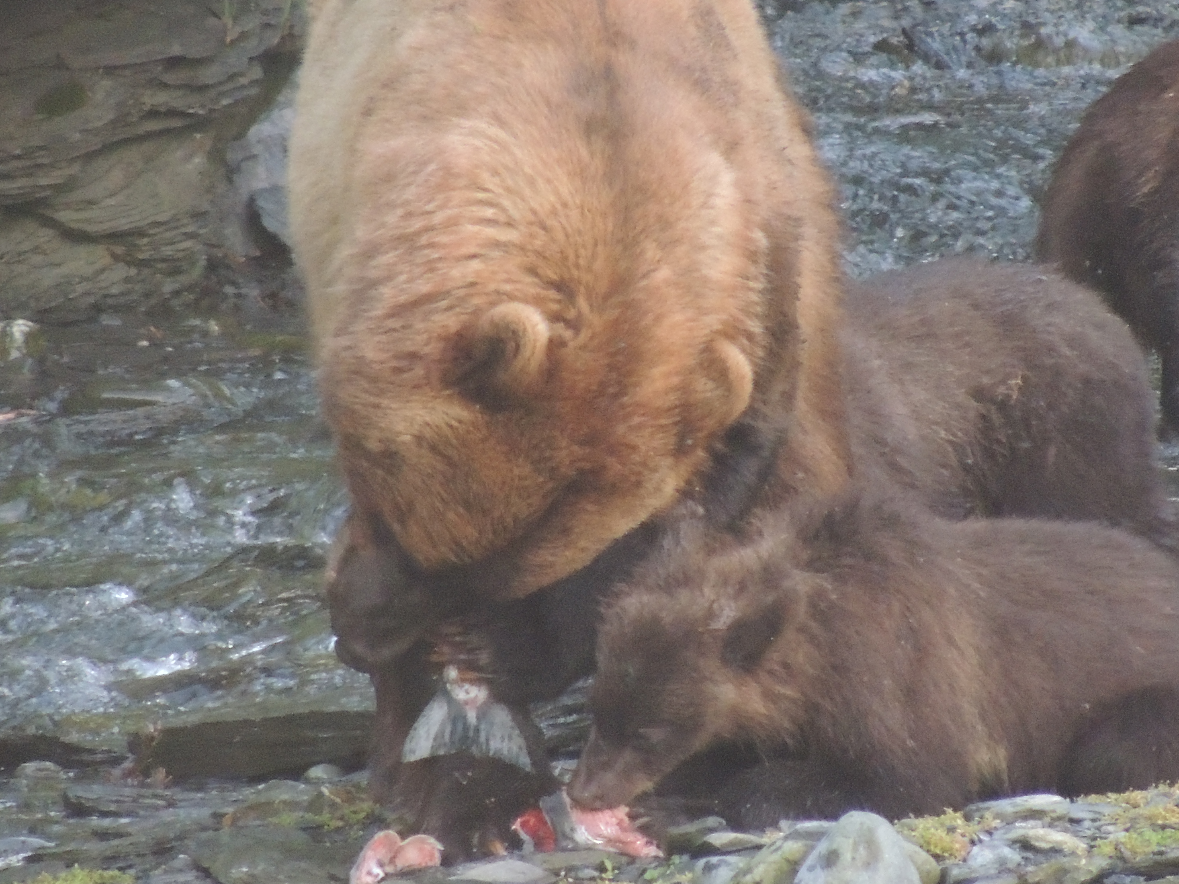 This is a scene of epic tragedy which is reinforced when we revisit this morning and watch one of the cubs feeding. The salmon have chosen the wrong stream. Not because of the bears, but because this stream goes nowhere. About 50 meters off the sea the stream runs out into a huge waterfall that not even these salmon can get up. The water in the stream is also only inches deep and cannot possibly allow them passage. They can hardly swim. These salmon were reared in hatchery up river and were able to swim down. Their instinct drives them back in a fruitless sex driven desire to reach their birth grounds upstream.