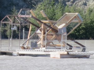 On the way to Valdez yesterday we have detoured to a small town called Chitina. This is on the Copper River, which in turn is home to the finest salmon in Alaska, the Copper River CoHo. We have lunch at the Chitina Hotel. The food is excellent but the service appalling. Non existent in fact. It is as if the waitress is in a time warp. we are here today and she is going to become energised tomorrow. After lunch we ride down to the river. Here they catch the Salmon using a fish wheel. This is an ancient design of a machine that has nets attached to a wheel, which in turn is driven by the flow of the water and catches fish that venture into it and then dumps them in an under water cage.
